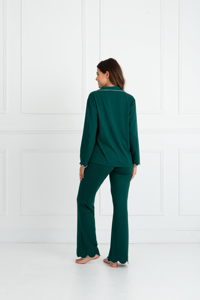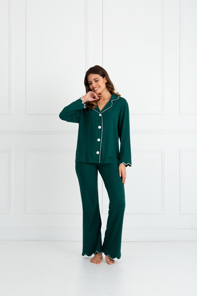 With its unrivalled softness, our bamboo jersey fabric redefines the art of relaxation and sleepwear, helping you drift off with ease. Thoughtfully designed with meticulous attention to detail, this set features a unique scalloped edge finish on the cuffs and lengths, complemented by elegant mother of pearl buttons. The fabric is carefully chosen to support temperature regulation, keeping you cool in the summer and warm in the winter, making these pyjamas a year-round staple in your capsule wardrobe.