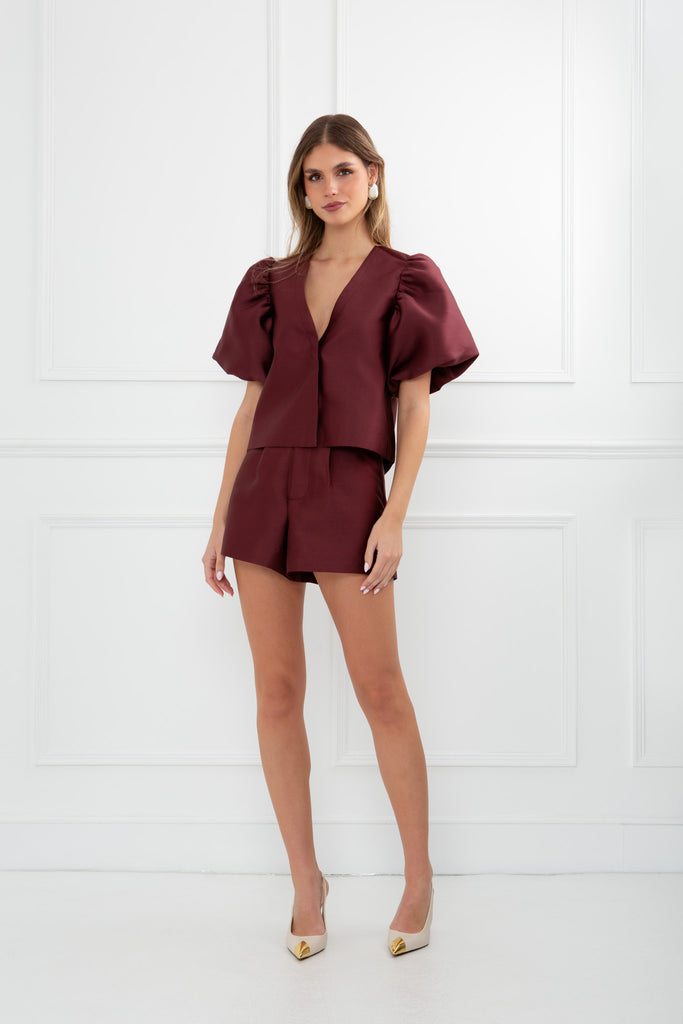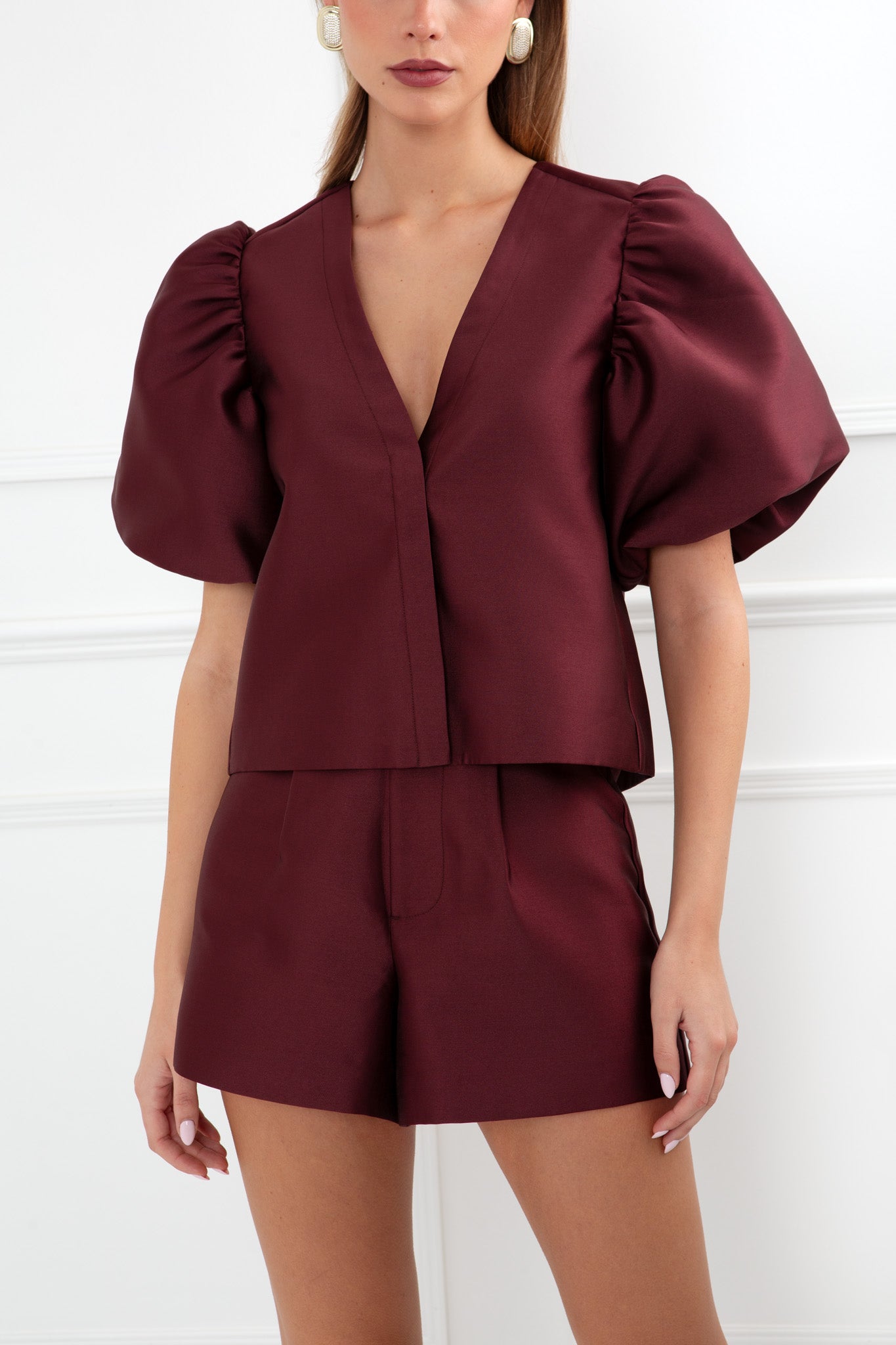 The Aurora jacket exudes sophistication with its voluminous puff sleeves, deep V neckline, and structured, luxurious weight, creating a beautifully flattering silhouette. Its versatile length, sitting perfectly between crop and regular, pairs effortlessly with both skirts and pants, offering endless styling possibilities.