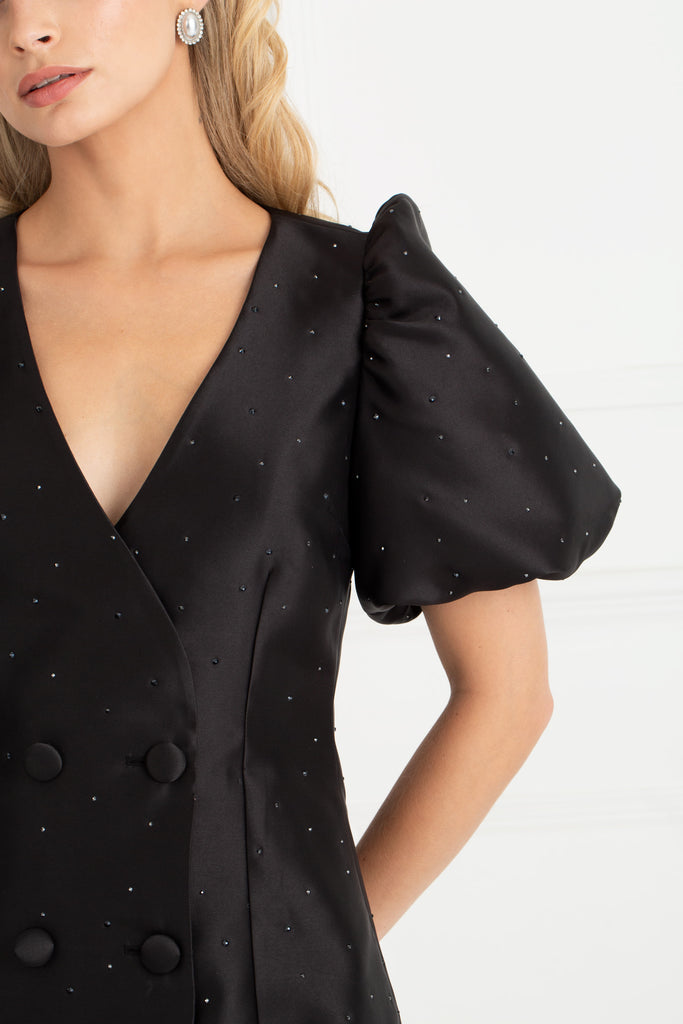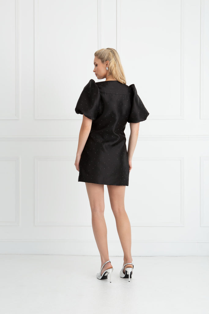 Our signature Aurora Short Sleeve Dress returns in a striking new colourway, reimagined in timeless black and delicately adorned with scattered diamantes. Each rhinestone catches the light beautifully, adding a subtle sparkle that makes this dress the ultimate partywear statement for the season ahead.
