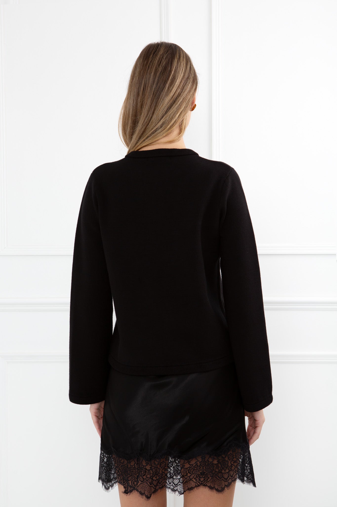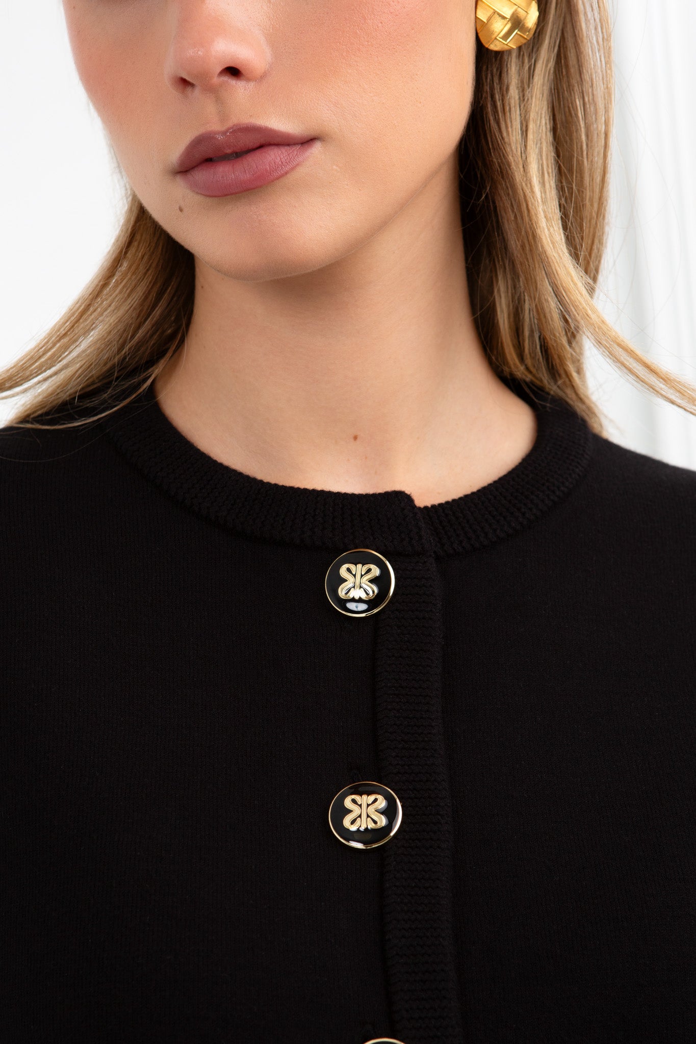 Crafted in a smooth, structured knit with subtle stretch, this black cardigan offers comfort without compromising on shape. Finished with signature gold-tone buttons embossed with the Sinead Keary The Label logo, it’s a considered piece designed to elevate even the simplest of looks.