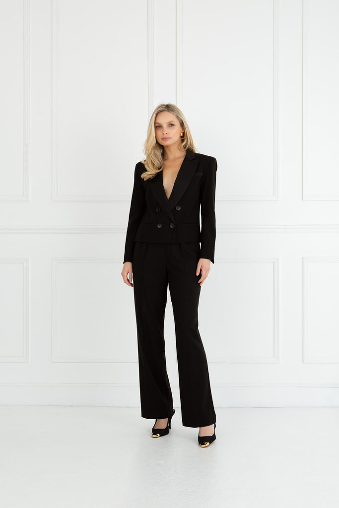 This season, we're excited to introduce the Tori Cropped Blazer, a chic update to our classic piece. Crafted from the same luxurious structured fabrication, the cropped version features a satin lapel, double-breasted closure, and our signature sleeve button placket cuff. The cropped length adds a contemporary edge, perfect for elevating any outfit.